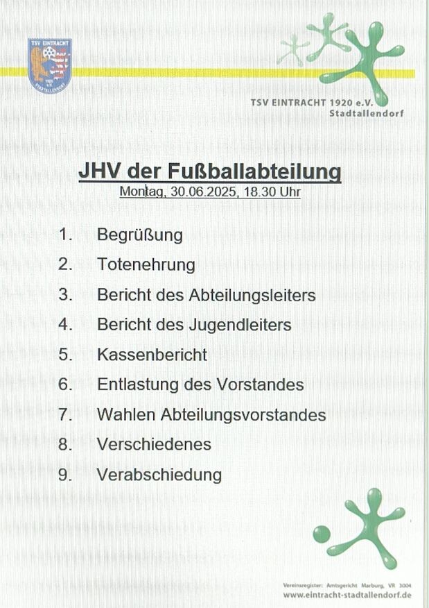 Die Fußballabteilung des TSV Eintracht Stadtallendorf lädt alle Mitglieder zur diesjährigen Jahreshauptversammlung am Montag, den 30.06.25 um 18.30 Uhr in das Vereinsheim am Herrenwaldstadion ein.